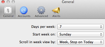 Preference dialog for Calendar on MacI’ve tried to use the Calendar app in Mountain Lion configured to ‘Scroll in week view by week, stop on today’ and just can’t get used to it. I agree this seems like a better use of space, but I have become so habituated to glancing at my calendar and associating position with day of week, I can’t break out of it. I always see the left-most column as Sunday, and the right-most as Saturday. In addition, I think there’s value in viewing time in actual weeks and months and years, I think that adds rather than detracts.