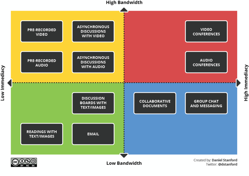 Stanford goes on to describe some of the pitfalls of holding class in real-time but remotely. He does a great job of plotting the various tools along the axes of immediacy and bandwidth. Worth a read as we debrief and take stock of the spring and prepare for fall classes.